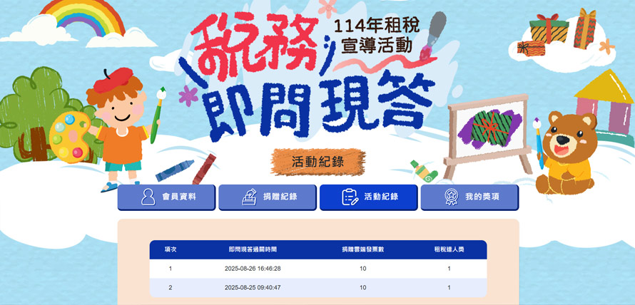 搭配稅務繪圖比賽的作品,結合簡單的刮刮看遊戲以及稅務問答 , 每天可以玩一次 , 控制宣導品兌換的數量